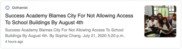 据《纽约邮报》报道,成功学院特许学校(Success Academy)计划在8月20日开始一些校内教学,并施行错开时间表,让学生在远程教学和校园教学之间交替。