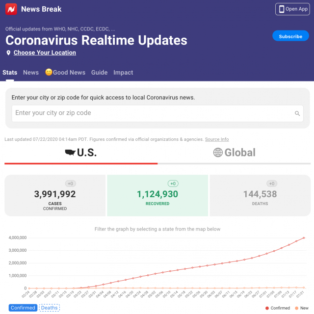 据News Break报道,根据WHO、NHC、CCDC、ECDC等官方数据,截止美国东部时间7月22日凌晨4:14,美国新冠累计确诊3991992,死亡144538例,康复1124930例。