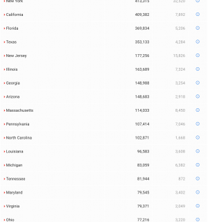 其中纽约州累计确诊413315例,死亡32520例;新泽西州累计确诊病例177256例,死亡15826例;康涅狄格州累计确诊病例48096例,死亡4406例;宾夕法尼亚州累计确诊病例107414例,死亡7046例。