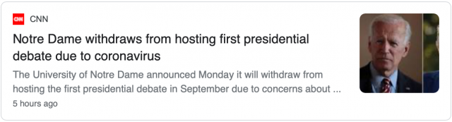 圣母大学不再承办首场总统大选辩论 指防疫措施降低教育价值