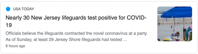 据侨报网报道,新泽西州有二十几名海滩救生员,在参加社交聚会后,被检测出感染新冠病毒肺炎。