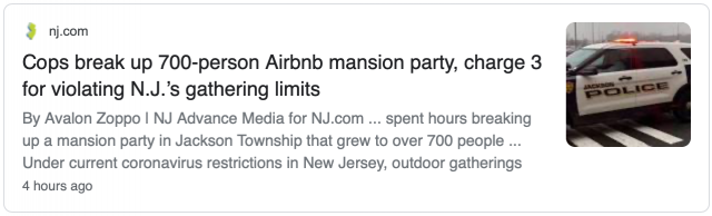 40岁的房主告诉警方,他在Airbnb上把房子租出去了。据调查显示,房主收到了传票,因为他违反了新州新冠防疫行政命令。来自纽瓦克的两名聚会组织者,一名23岁的女性和一名22岁的女性,也收到了传票。