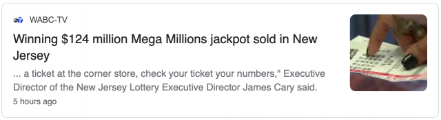 据abc7ny报道,售出这张彩票的商店位于巴约纳(Bayonne)肯尼迪大道(Kennedy Boulevard)的Brenda’s Inc.,这也意味着该商店将获得一张自己的3万美元支票。