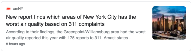 根据他们的发现,绿点(Greenpoint)/威廉斯堡(Williamsburg)地区是今年报告的空气质量最差的地区,311电话共接到175起空气质量相关的投诉。