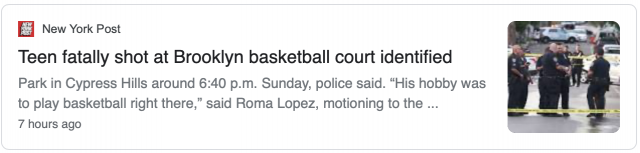 据纽约邮报报道,一位家人朋友表示,在布碌仑的一个篮球场被枪杀的这名16岁男孩非常喜爱篮球,而且“一直”和朋友在公园里打篮球。