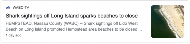 据abcny报道,亨普斯特德镇的一名救生员第一次报告说,他在冲浪板上看到了一条巨大的鲨鱼。他们不确定确切的尺寸。Hempstead镇与长滩、琼斯海滩和南岸沿岸的所有海滩相连。