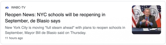 据PIX11报道,纽约市长白思豪宣布,纽约市计划在今年秋天重新开放学校。超过45万个家庭对返校调查做出了回应,75%的家庭希望在九月份可以返校。市府将与老师、校长和家长一起制定多种计划和应急措施。正在讨论的计划包括强制性的口罩,包括学校为没有口罩的学生提供免费的备用口罩,教室的社交距离布局,带消毒剂的洗手站和管理员每天深度清洁等。