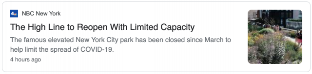 高线公园是纽约市为数不多的私人公园之一。纽约市公园管理部门运营的公园在新冠疫情爆发期间一直开放,为纽约人提供安全的户外活动空间。为了创造更多的开放空间,该市还在五个行政区的一些街道上限制车辆通行。