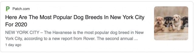 根据patch网站报道,Rover对从50多万宠物主人收集来的数据进行分析,确定狗狗受欢迎程度。在他们发布的第二份年度报告中,对全美最受欢迎的20个犬种进行了排名,对纽约等全美50个最大城市,也排出了最受欢迎的前五名狗狗。