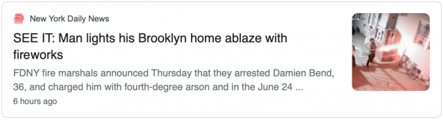 据ABC7 New York报道,上周三(6月24日),布碌仑平原区(Flatlands, Brooklyn),东51街(East 51st Street)一幢2层半住宅房屋,36岁男子班得(Damien Bend)站在行车道上,把一个烟花筒朝一楼一个打开的窗户燃放,烟花火星冲进房屋中爆炸,致使自己家房屋起火。