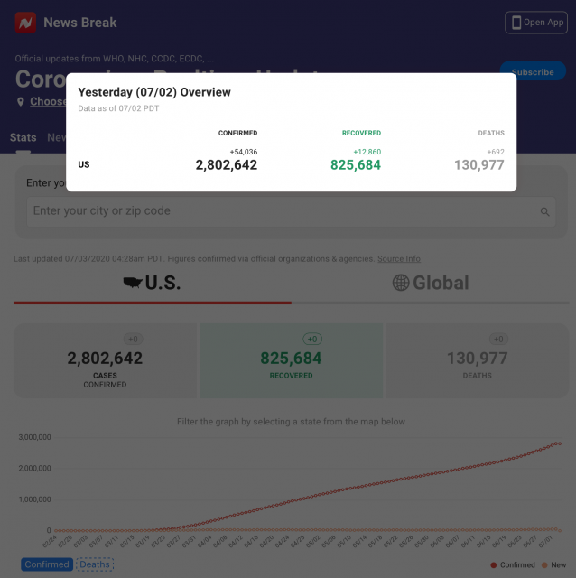 据News Break报道,根据WHO、NHC、CCDC、ECDC等官方数据,截止美国东部时间7月3日凌晨4:28,美国新冠累计确诊2802642例,死亡130977例,康复825684例。