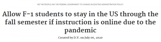 据侨报讯,7月6日,白宫请愿网站We the People发布请愿书,就特朗普政府6日宣布的有关留学生签证的新规征求意见。