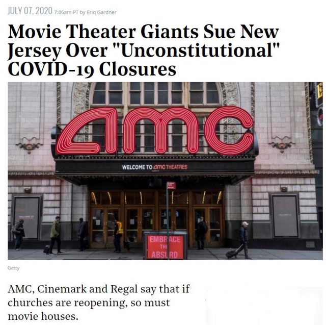 据侨报网综合讯,由于新冠肺炎疫情反弹,新泽西、加州等地方政府下令原定7月中旬重开的电影院继续关闭。但电影院不干了,AMC、Regal、Cinemark等院线巨头近日把新泽西州政府告上法庭,认为新泽西州不允许电影院复工,也未明确复工时间,是违法行为。