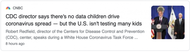 但白宫卫生顾问博克斯(Deborah Birx)博士在简报会晚些时候说,目前还没有足够的数据得出这个结论。她说,数据是不完整的,因为美国没有对足够多的儿童进行测试,因此无法明确病毒在18岁以下人群中的传播程度,以及他们是否将病毒传染给其他人的结论。