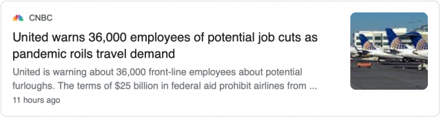空乘人员工会和其他航空公司劳工组织正在游说国会批准另外250亿美元的工资援助,以保护工作岗位直到明年3月。但一位美联航高管对国会是否会在选举年批准这项开支表示怀疑。“我们觉得不能指望政府的额外支持来维持生存,”这名不愿透露姓名的官员对记者说。