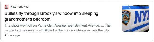 据纽约邮报报道,枪击发生在贝尔蒙特大道(Belmont Avenue)靠近范·斯克林大道(Van Siclen Avenue),穿透了一楼的门框和二楼的窗户。
