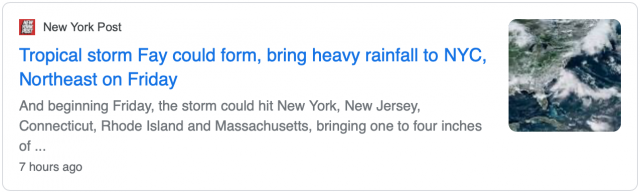 热带风暴Fay可能形成 周五将给纽约市带来强降雨