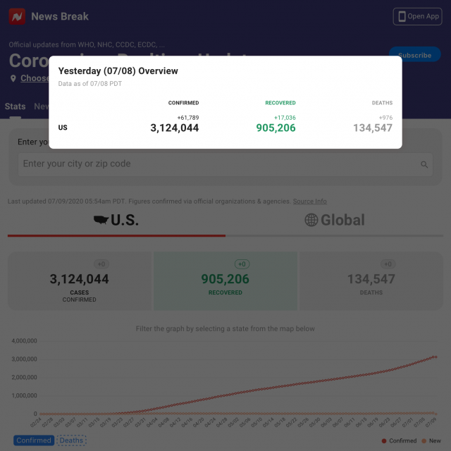 据News Break报道,根据WHO、NHC、CCDC、ECDC等官方数据,截止美国东部时间7月9日凌晨5:54,美国新冠累计确诊3124044,死亡134547例,康复905206例。
