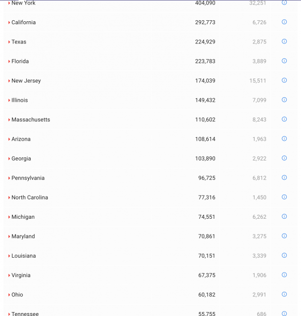 其中纽约州累计确诊404090例,死亡32251例;新泽西州累计确诊病例174039例,死亡15511例;康涅狄格州累计确诊病例47108例,死亡4343例;宾夕法尼亚州累计确诊病例96725例,死亡6812例。