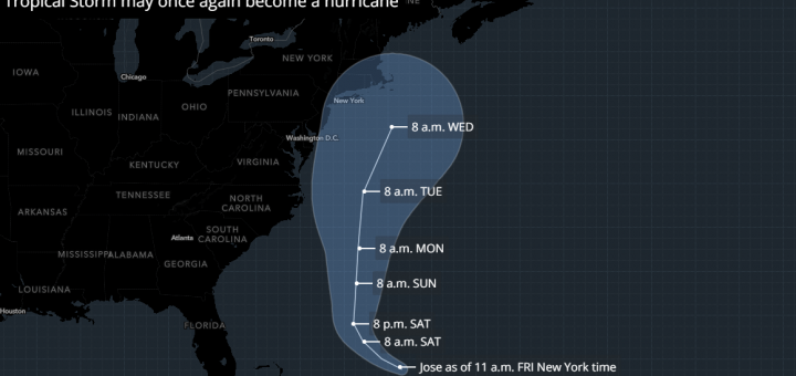 根据国家飓风咨询中心(National Hurricane Center advisory,简称NHC) 的报告,新一轮的飓风Jose下周可能会威胁到威胁到纽约市及东海岸的其他地区。