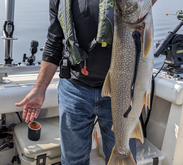 波光粼粼的 Lake Superior 上一名钓鱼者站在船尾处扬手拖拽起一条美丽的 32.5 英寸湖鳟鱼,这条鱼很平静,就像已经死掉一样,而它的身上却附着一个奇怪的东西,那东西在阳光下扭曲着,看着格外恐怖。