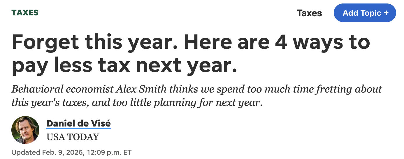 “别再纠结今年的税了。”这是行为经济学家亚历克斯·史密斯给纳税人的第一句话。在他看来,太多人把精力花在为已经发生的收入“补救”,却很少认真规划如何通过改变现在的行为,让明年的税单更轻。
