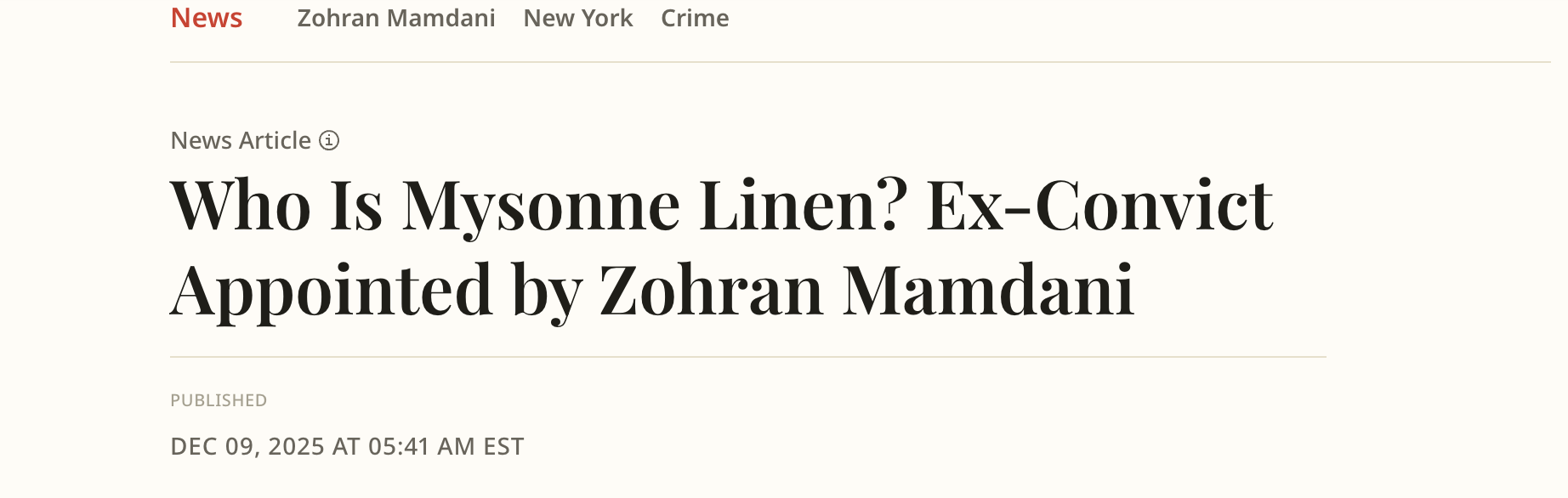 纽约市当选市长佐兰·曼达尼(Zohran Mamdani)近日宣布的过渡团队名单中,一个名字引发了轩然大波:迈索恩·利宁(Mysonne Linen),一位曾因持械抢劫罪被判入狱七年的前说唱歌手,被任命为新政府刑事...