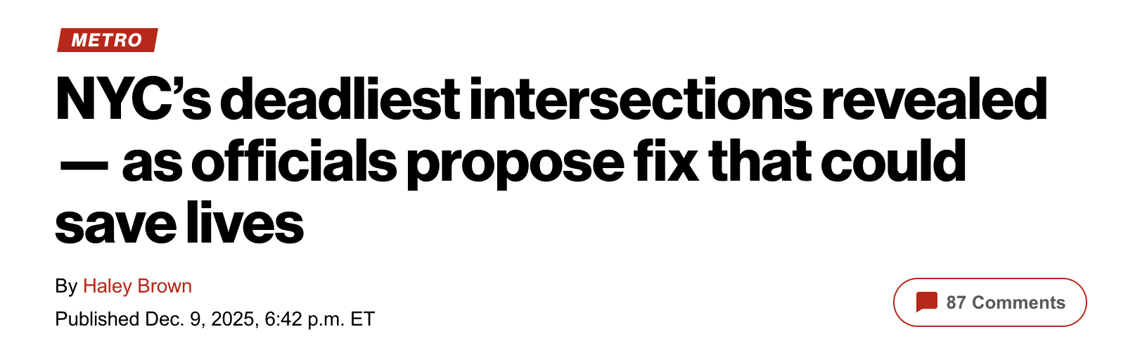 周二,一张由交通安全组织“交通安全街道替代方案”绘制的红色斑驳地图,刺目地呈现在纽约人面前。地图上密密麻麻标注的118个十字路口,并非普通地标,而是过去三年里至少发生过五起致人死亡或重伤事故...