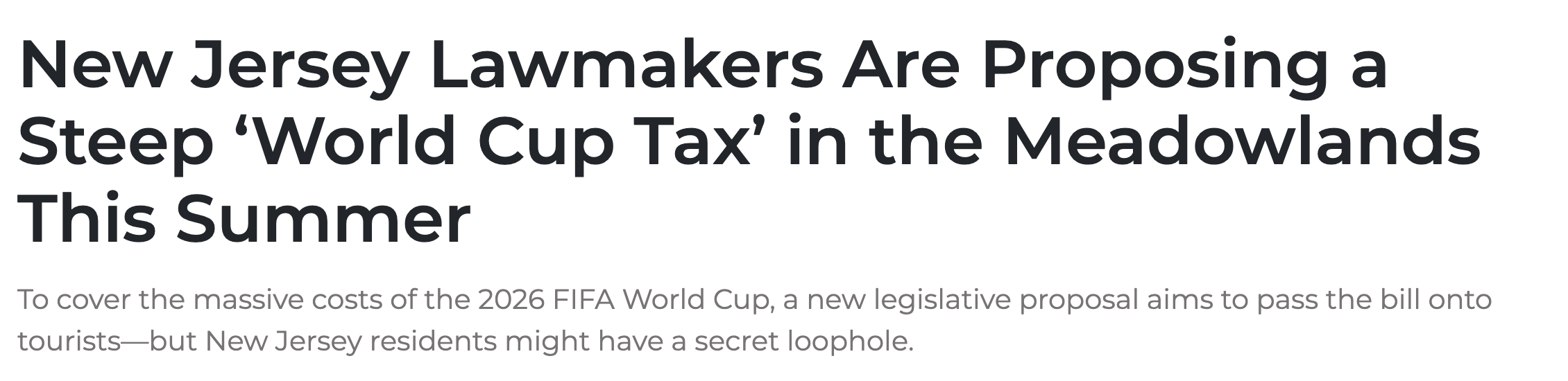 随着2026年 FIFA World Cup 2026 临近,新泽西州正为迎接这一全球盛事做最后冲刺。但就在赛事筹备进入关键阶段之际,一项被称为“世界杯税”的立法提案,却在当地引发巨大争议——支持者称这是“让游客买...