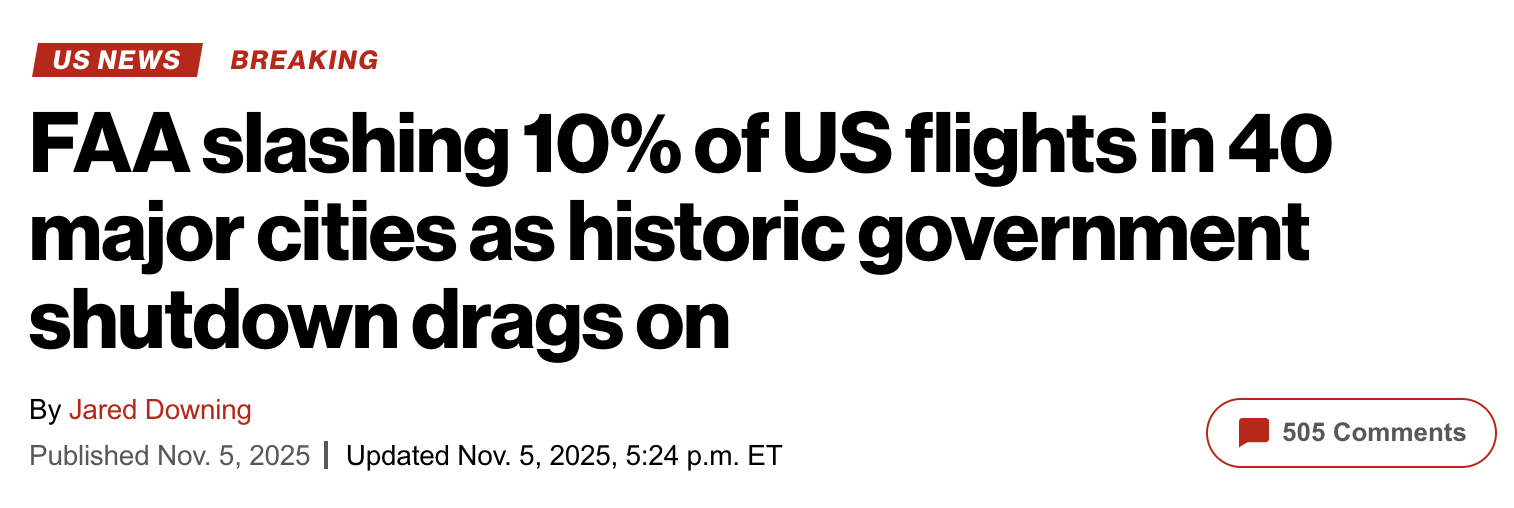由于持续的历史性政府停摆,美国联邦航空管理局(FAA)宣布,从周五早上开始,将在全美40个主要城市削减10%的航班。这一决定预计将使数百万旅客陷入困境,并进一步加剧本已严重的航班延误问题。