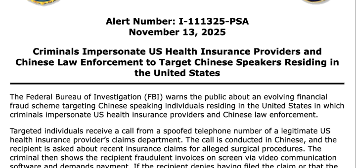 美国联邦调查局(FBI)近日发布公共服务公告,警示居住在美国的华语人士正成为诈骗分子的新目标。这些犯罪分子精心设计骗局,冒充美国医疗保险公司和中国执法人员,诱骗受害者泄露个人身份信息并支付巨额款项。