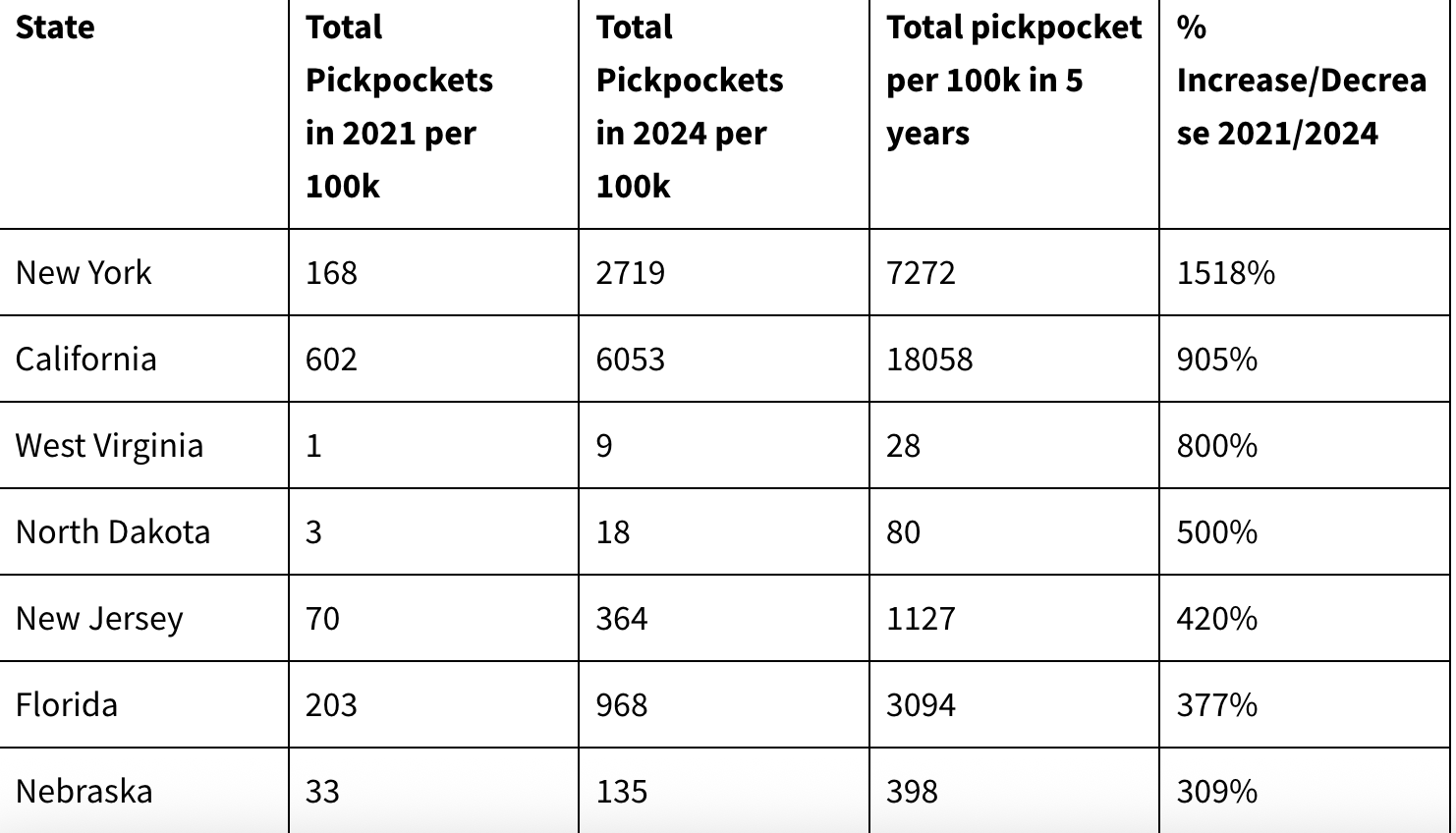 随着繁忙的假日旅行季临近,数百万美国人准备涌向机场、购物区和节日市场,最新数据显示,美国各地的扒窃案件正急剧增加,其中纽约州的情况尤为严峻,短短三年间报案数量惊人地增长了1518%,堪称美国的"扒窃之都"。