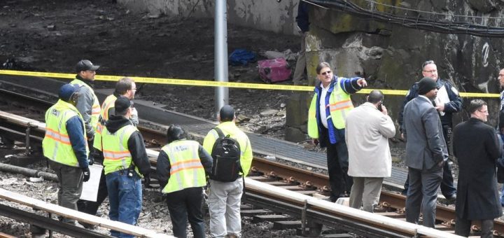 在泽西城Journal Square交通中心外的火车轨道上,惊现一名婴儿遗体,相关部门调查人员一道现场取证调查事故原因。