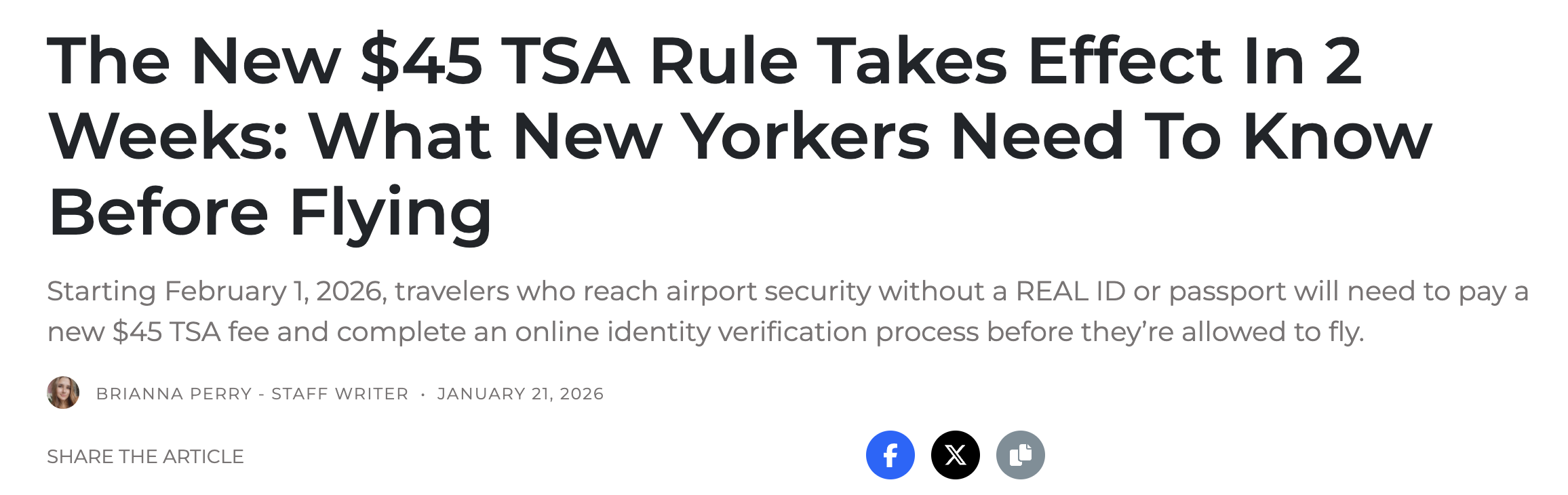 如果你计划在下个月从纽约出发坐飞机,无论是肯尼迪机场(JFK)、拉瓜迪亚机场(LGA),还是纽瓦克机场(EWR),现在都该低头看一眼自己的驾照了——右上角有没有那颗“星”,可能直接关系到你能不能顺利...