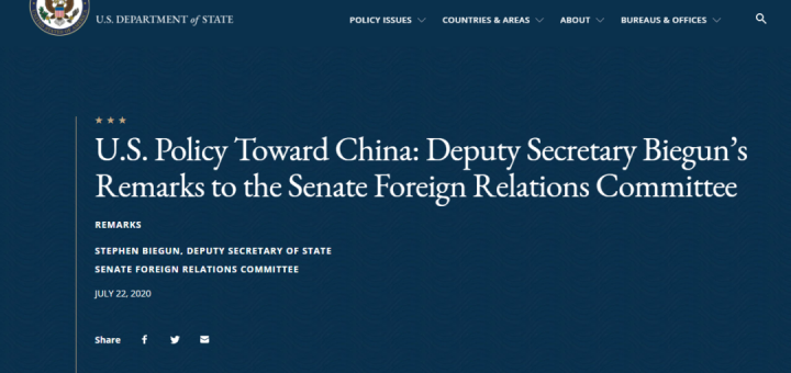 美国当地时间7月22日,美国国务院副国务卿斯蒂芬·比根(STEPHEN BIEGUN)在参议院外交关系委员会发表讲话,首次全面公开回应了近期中美局势以及美国对华政策;其中也特别提到了为何关闭中国驻休斯敦总领事馆。