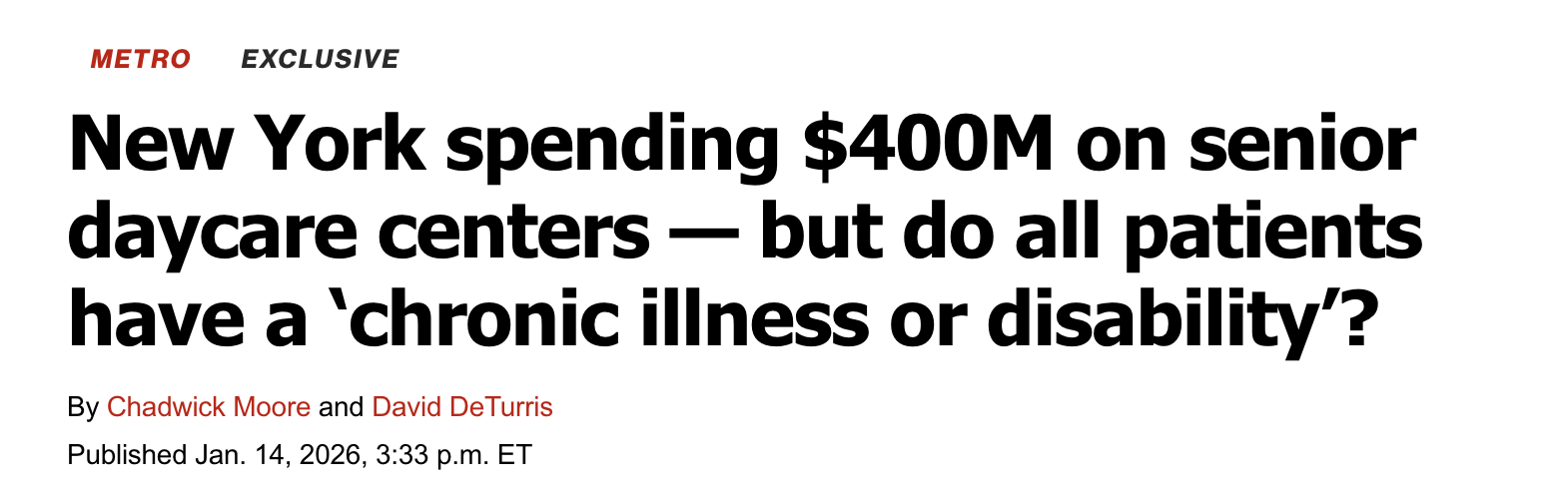 纽约州每年在“社会成人日间护理中心”(Social Adult Day Care,简称 SADC)上的支出高达4亿美元。这类机构在制度设计上,本应只服务患有“慢性疾病或功能性残疾”的老年人,目的是让他们避免过早进入养...