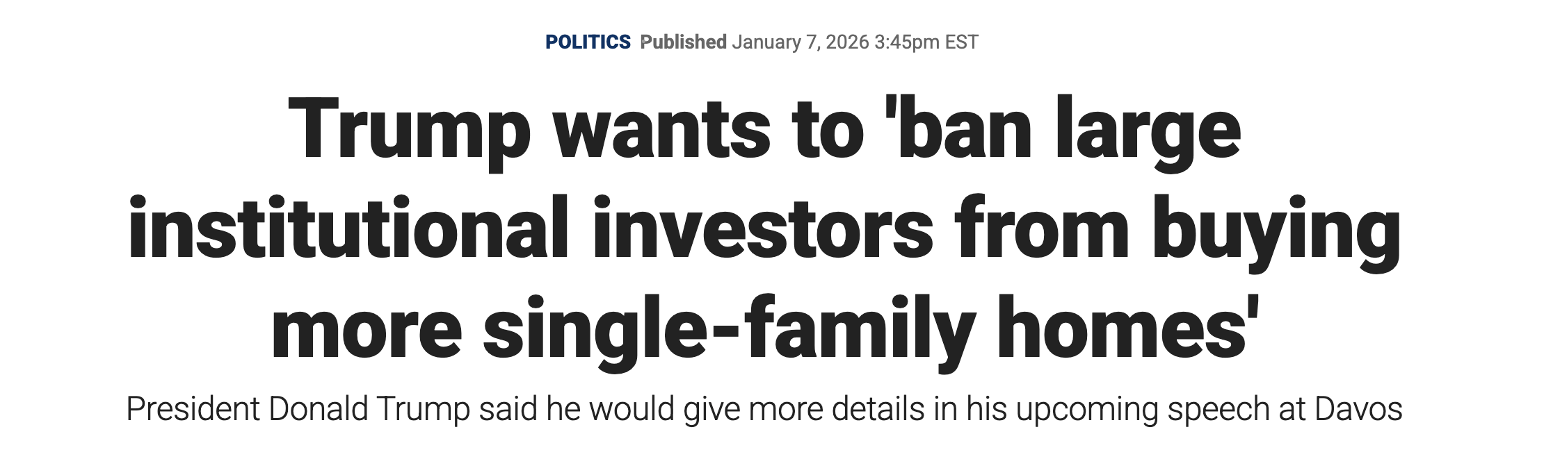 0 北美 2026年1月8日 由 wy · Published 2026年1月8日 · Last modified 2026年1月9日 特朗普重拳砸向华尔街房东:禁止大资本买房,房企股价瞬间跳水 唐纳德·特朗普总统近日高调抛出一项震动房地产与资本市场的提议——禁止大型机构投资者继续购买独栋住宅。他直言不讳地表示,住房应当属于普通美国人,而不是企业资本,“人们住在房子里,而不是公司里”。