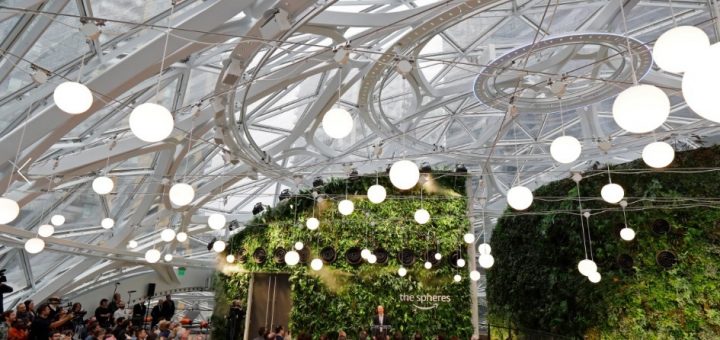 网路零售巨擘 Amazon 在西雅图总部附近的全新办公园区「生态圈Spheres」在周一(1/29)正式启用。