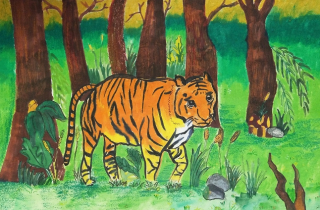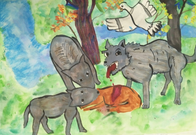 When the wolves saw Tiger coming, they all ran away in fright, leaving the dead deer behind. Smart pigeon told the tiger, " Enjoy your meal. I’m going home. Meet me here early tomorrow morning." Tiger wolfed down the dead deer. It was his first satisfying meal after becoming an outcast.