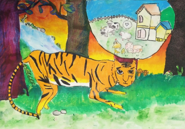 One day, as dusk cast long shadows over the woods, Tiger still had not eaten anything; his stomach was growling. Though he searched desperately, he could not find any food. Suddenly, Tiger recalled that there was a village nearby. The cows, sheep, pigs and chickens raised by the farmers in the village would probably be easy prey for him. He decided to try his luck, and go over to the village to see if he could catch something to fill his stomach.