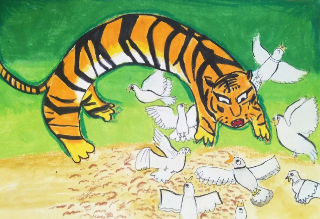 As Tiger walked feebly on the dirt road that led to the village, he spied a group of pigeons in the distance, pecking at some corn kernels. In his eagerness to catch a meal, Tiger rushed forward. The pigeons immediately saw Tiger running towards them so they all flew away. Tiger was very annoyed that he could not even catch a pigeon, but then he realized the pigeons might fly back because there were still many corn kernels left on the ground. So he hid himself in the bushes by the roadside.