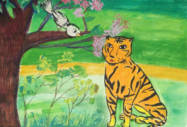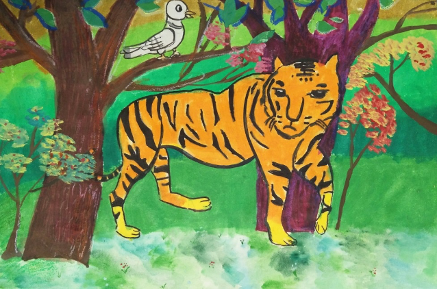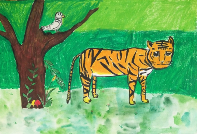 Tiger looked up into the tree, disappointed that he had not managed to catch the pigeon. Tiger turned to leave, but before he could do so, Smart pigeon called from high up in the tree, "Don't go yet! I know you, aren't you Tiger, the former king? How did you come to be so thin? We always used to pay tribute to you with the best meat! You always used to be so picky, but now you are fine with eating pigeon meat!"