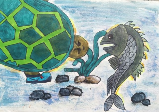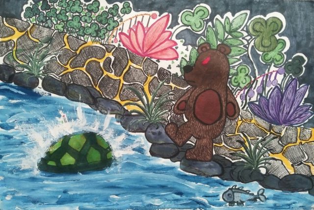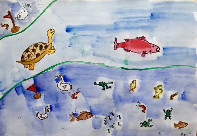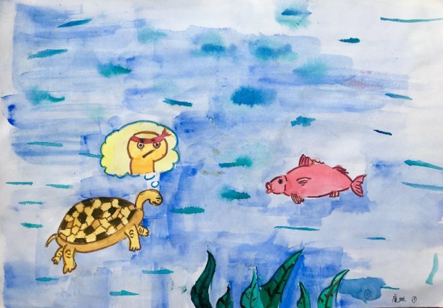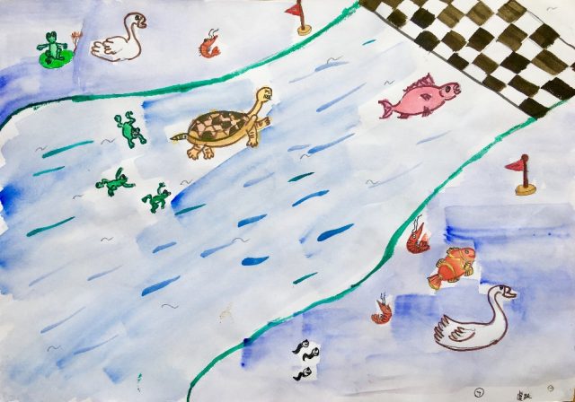 The turtle flapped his limbs with all his might but moved slowly with little effect. Despite cheers from turtle’s fans including the frog, the bass was still far ahead and reached the other side first.
