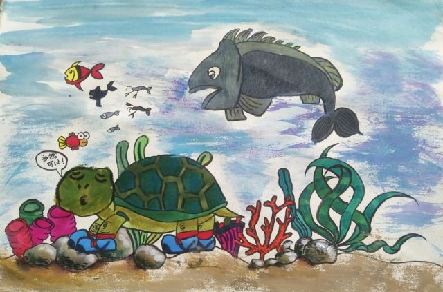 The turtle satirized the bass, "People often say that the frog that lived in the bottom of the well had never seen the world. You yourself live in the wide water, but it seems that your knowledge is also limited to what you see in the water, and do not know the comings and goings elsewhere." The bass sensed the turtle’s satire. He thought the turtle was arrogant and decided to teach him a lesson. He challenged the turtle, "Since you run fast on land and can beat the rabbit, I challenge you to have a swimming race with me."
