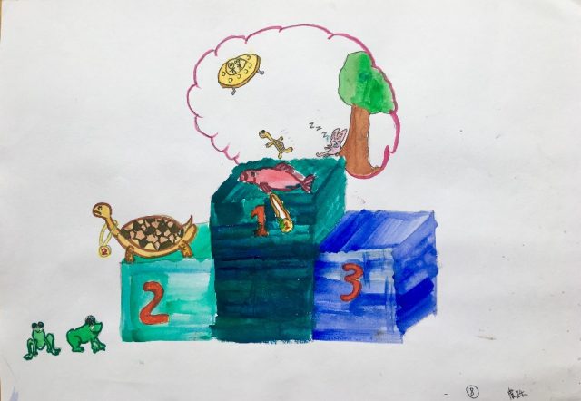 乌龟摆动四肢,拼命追赶。尽管乌龟的粉丝青蛙们尾随乌龟,为他加油,鲈鱼依然遥遥领先到达对岸。
