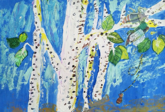 The cicada climbed out of the shell, hung upside down from it, and slowly unfolded his wings. Just then, he felt an itch on his calf. He looked at it carefully, and found that an ant was brushing his leg with its tentacles.