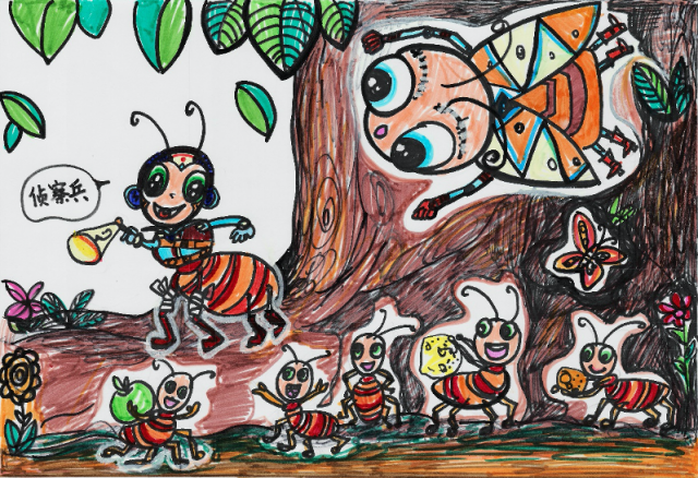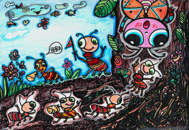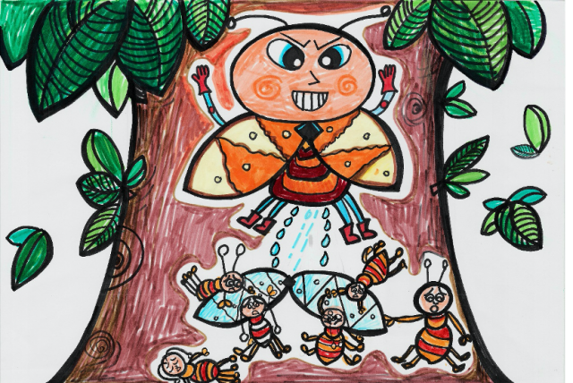 The cicada realized that the ants were trying to crush his peeled shell into fragments, and then move those small pieces to their home. He felt that although the shell was useless, it was still, after all, his used "coat". He could not let the ants crush it in front of him. He turned his back on the ants, and peed. All of the ants surrounding the shell were washed down the tree. Then the cicada flapped his wings, sang a loud "Gi----," and flew happily away.