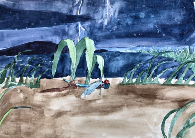 Thick, dark storm clouds appeared in the sky followed by a bright flash and a loud sound from thunder. Heavy rains would soon pour down. The earthworm found several curved leaves and inserted the ends of the leaves into the soil in an arch to create a leaf tent on top of the dragonfly, so that she would not get wet.